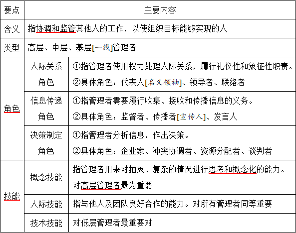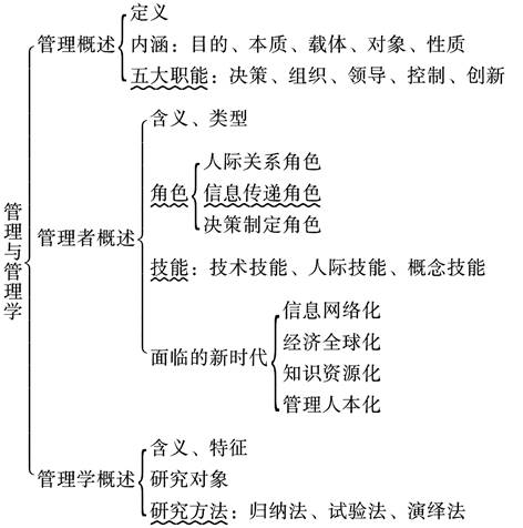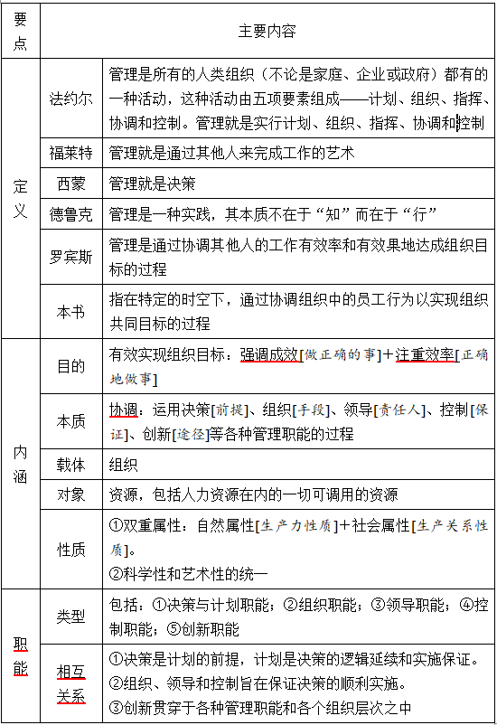 本章主要介绍管理、管理者与管理学的基础知识,属于基础章节。学习时,要掌握管理的概念、职能和性质;重点掌握管理者的角色和技能,能够判断不同层级的管理者扮演的角色及其对应需掌握的技能。本章重点考查简答题和论述题,重要概念也常考概念题,复习时要注重理解,切忌死记硬背。