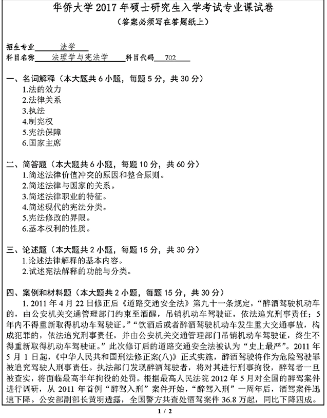 2017年华侨大学《702法理学与宪法学》考研真题