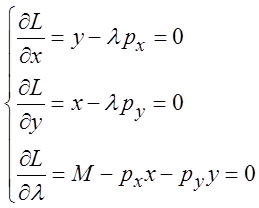 构造拉格朗日函数:L=xy-λ(pxx+pyy-M)。
