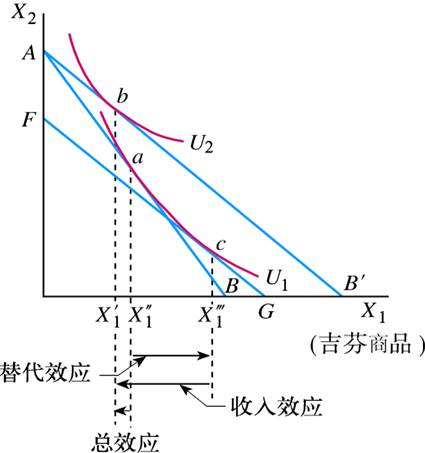 如图1所示,横轴OX1和纵轴OX2分别表示商品1和商品2的数量,其中,商品1是吉芬商品。消费者最初选择a点,随着商品1价格的下降,消费者选择b点,吉芬商品1价格的下降反而导致了对该商品需求的减少。商品1价格下降的效应可以被分解成替代效应X1″X1‴和收入效应X1‴X1′。吉芬商品的特殊性在于:它的收入效应的作用很大,以至于超过了替代效应的作用,从而使得总效应与价格同方向变动。这也就是吉芬商品的需求曲线呈现向右上方倾斜的特殊形状的原因。
