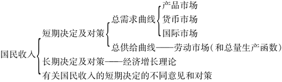 宏观经济学把经济活动主体分为家庭、企业和政府三大部门,把市场归结为产品市场、货币市场和劳动市场三大类,其基本理论框架就是对三大部门在三大类市场中所发生的相互作用进行研究。