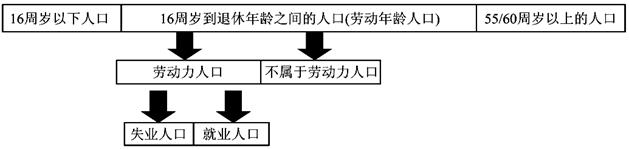 一个经济中的人可以被归入三种类型:就业人口、失业人口和非劳动力。非劳动力包括家务工作者、退休者、学生、病残者,劳动力包括就业者和失业者,具体关系见图12-2。