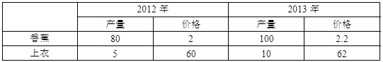 2一个国家生产香蕉和上衣两种商品,2012年和2013年生产两种商品的数量和价格分别为: