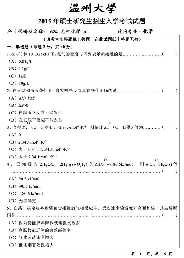 1. 温州大学化学与材料工程学院《无机化学》历年考研真题汇总