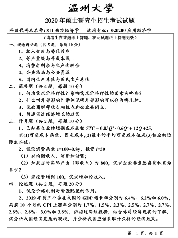 1. 温州大学商学院《811西方经济学》历年考研真题汇总