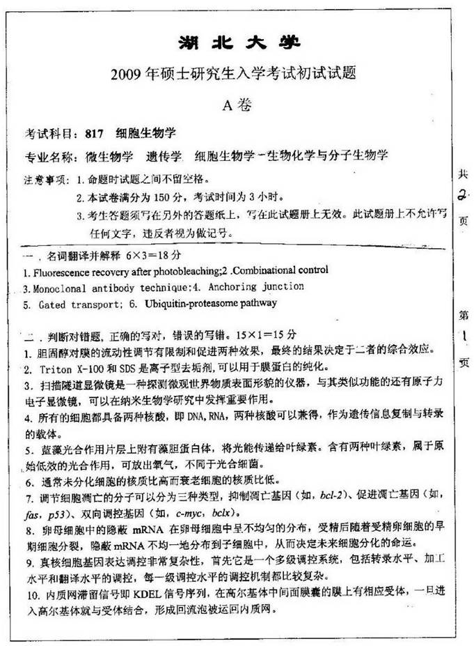 2009年湖北大学817细胞生物学(A卷)考研真题