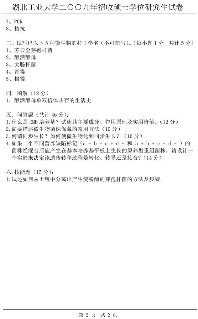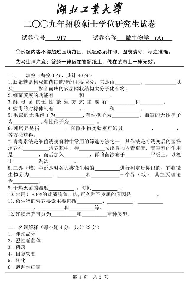 1. [电子书]湖北工业大学生物工程与食品学院《917微生物学》历年考研真题汇总