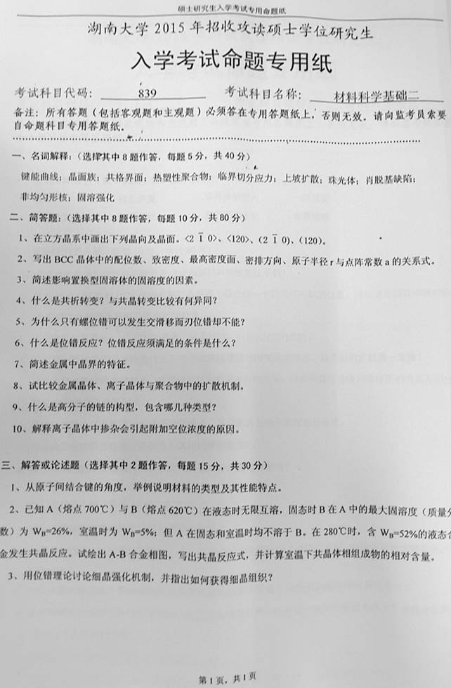 2015年湖南大学839材料科学基础(二)考研真题