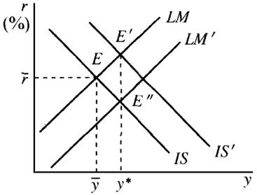 答:(1)在IS和LM曲线的交点上同时实现了产品市场和货币市场的均衡。然而,这一均衡不一定是充分就业的均衡。例如在图3中,和交点E所决定的均衡收入和利率是y和r,但如果充分就业的收入是y*,此时均衡收入低于充分就业收入。这时靠市场的自发调节,无法实现充分就业均衡,此时国家可以用财政政策或货币政策进行调节。增加政府增加支出或降低税收,IS曲线就会向右上方移动。当IS上移到IS′时和LM线相交于E′点,就会达到充分就业的收入水平。同时中央银行增加货币供给,LM曲线向右下方移动。如果移动到LM′时和IS曲线相交于E″也会达到充分就业的收入水平。当然,国家也可以同时改变税收、政府支出和货币供给量来同时改变IS和LM的位置,使二者相交于y*垂直线上,以实现充分就业。