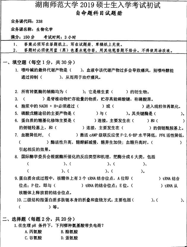 1. 湖南师范大学《338生物化学》历年考研真题汇总