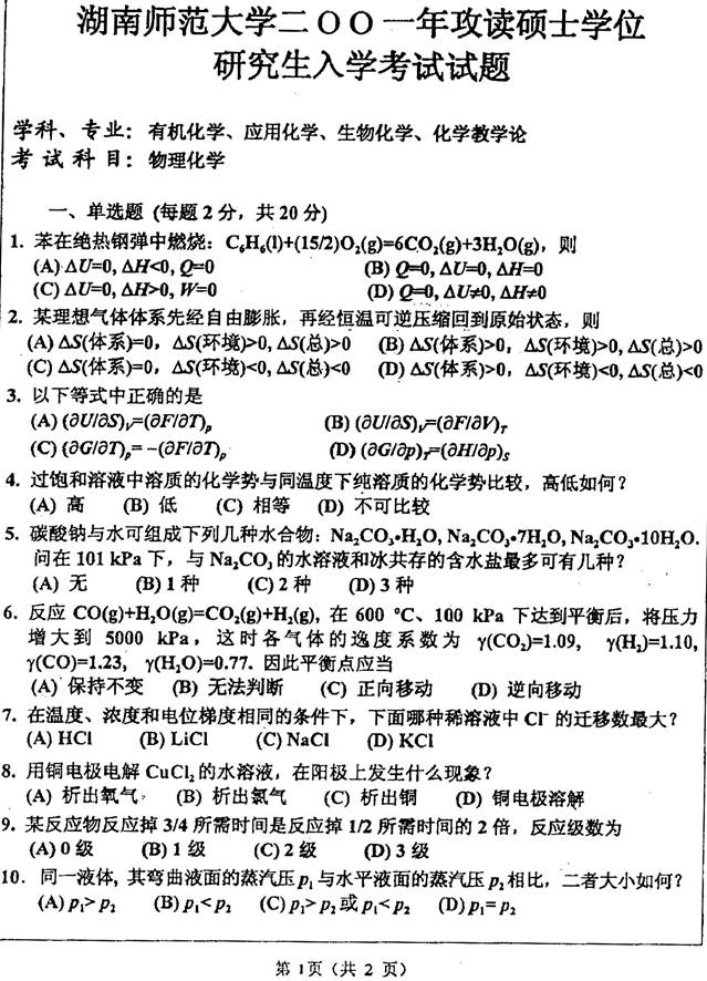 2001年湖南师范大学《物理化学》考研真题