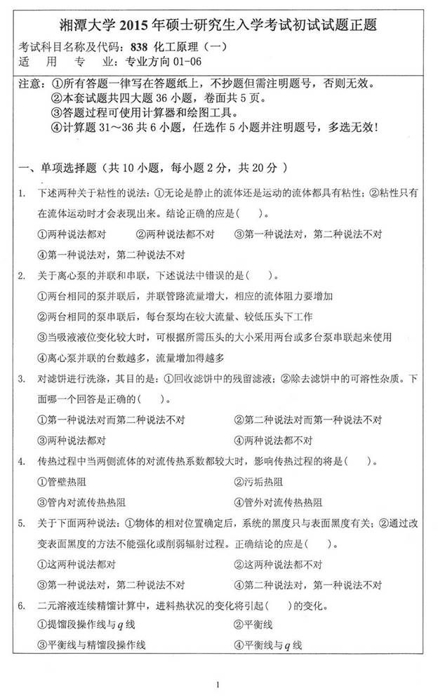 1. 湘潭大学化工学院《化工原理》历年考研真题汇总