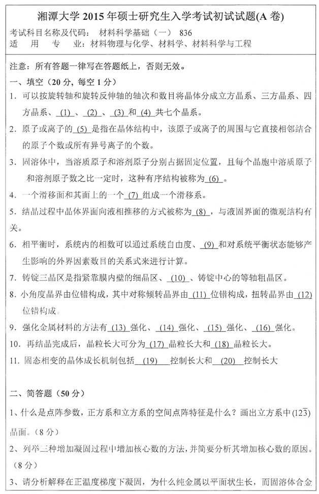 1. 湘潭大学材料科学与工程学院《材料科学基础》历年考研真题汇总