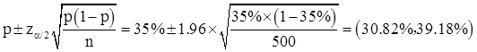 解:已知n=500,z0.05/2=1.96。根据抽样结果计算的样本比例为:p=175/500=35%