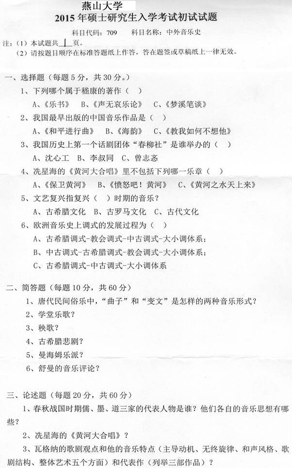 2015年燕山大学艺术与设计学院709中外音乐史考研真题