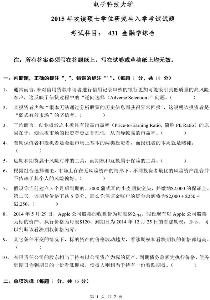 1. 电子科技大学经济与管理学院《431金融学综合》[专业硕士]历年考研真题汇总(含部分答案)