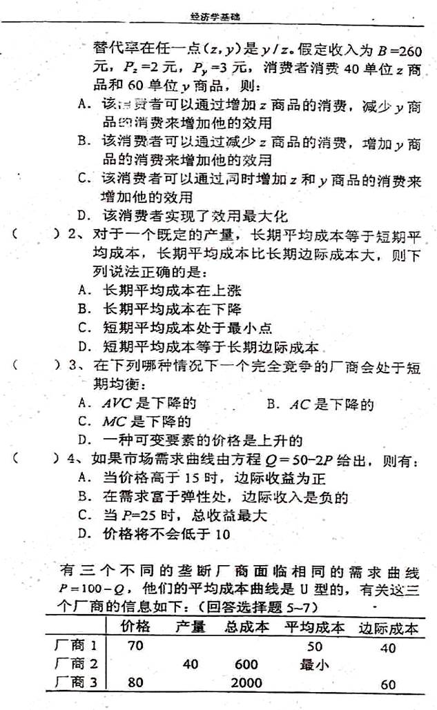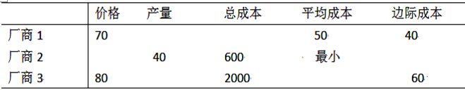 有三个不同的垄断厂商面临相同的需求曲线P=100-Q,他们的平均成本曲线是U型的,有关这三个厂商的信息如下:(回答选择题5~7)