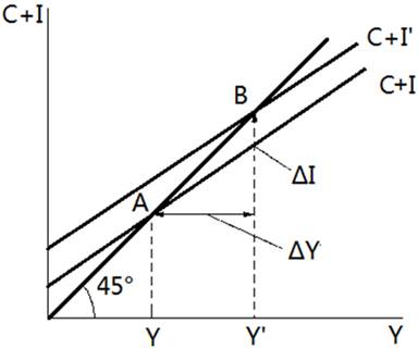 在存在闲置生产能力的条件下,如果自发投资增加,必然会提高有效需求,从而引起国民收入的成本增长,即ΔY=kΔI,其中k为乘数且k=1/(1-边际消费倾向)。