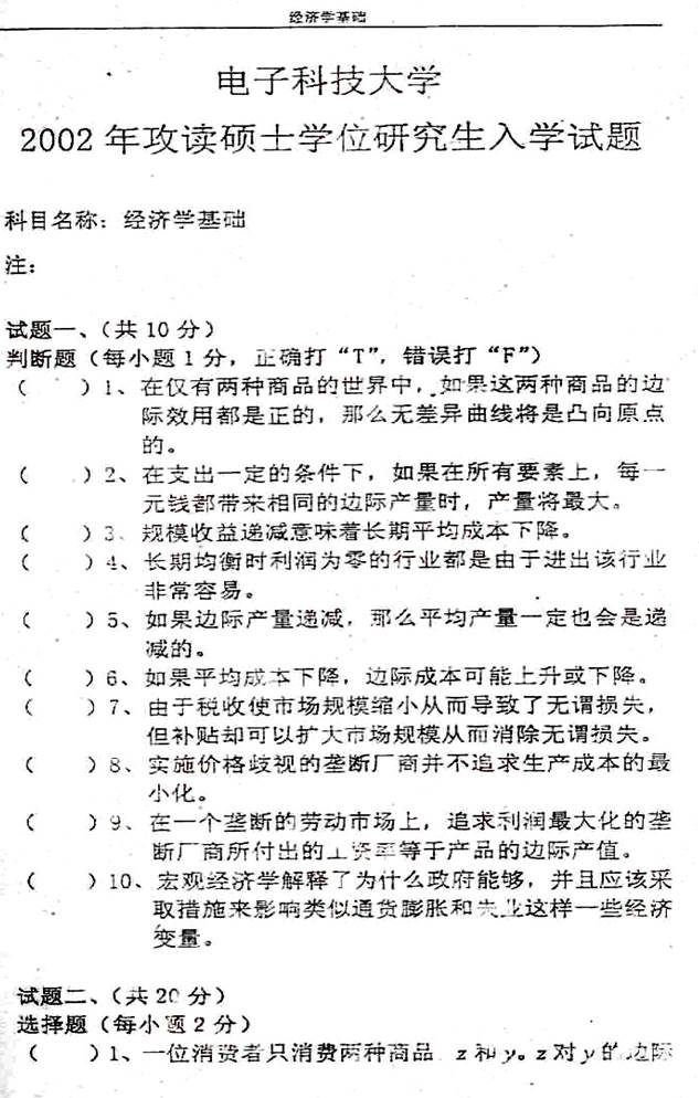 2002年电子科技大学经济与管理学院401经济学基础考研真题