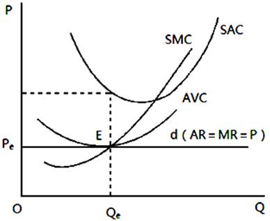 【解析】如图4所示,该完全竞争厂商处于短期均衡,在均衡点E处,有MR=AR=P=SMC=AVC,由于P=AVC,厂商生产的所有收益全部弥补短期可变成本,此时厂商可以继续生产,也可以不生产,在此均衡情况中,AC是下降的。