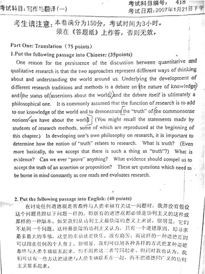 2007年福建师范大学外国语学院630英语写作与翻译考研真题