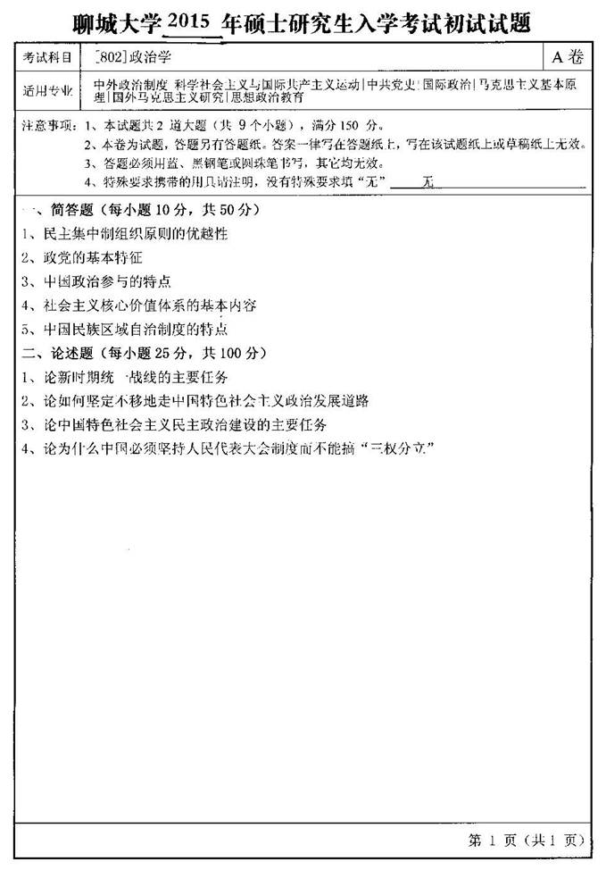 2015年聊城大学802政治学(A卷)考研真题