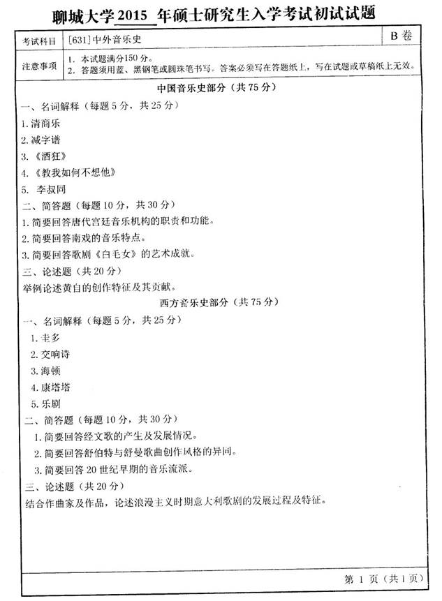 2015年聊城大学音乐学院631中外音乐史考研真题