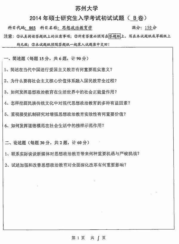 1. 苏州大学马克思主义学院《803思想政治教育学》历年考研真题汇总
