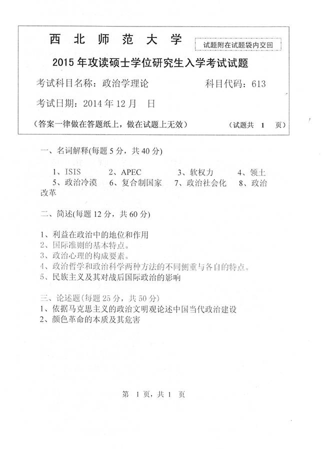 2015年西北师范大学613政治学理论考研真题