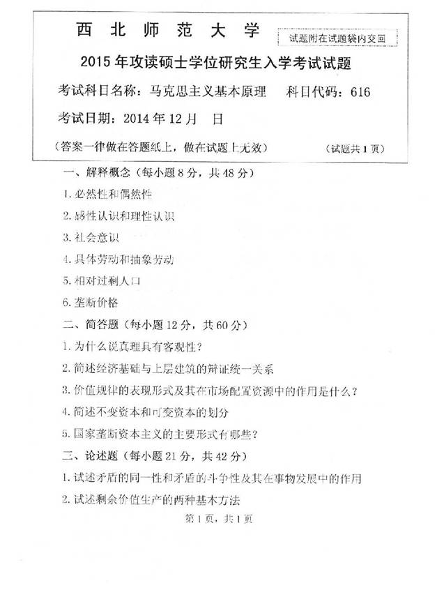 1. 西北师范大学马克思主义学院《616马克思主义基本原理》历年考研真题汇总