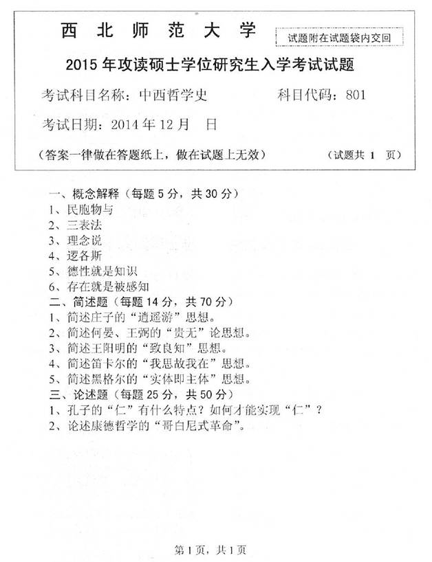 2015年西北师范大学马克思主义学院801中西哲学史考研真题