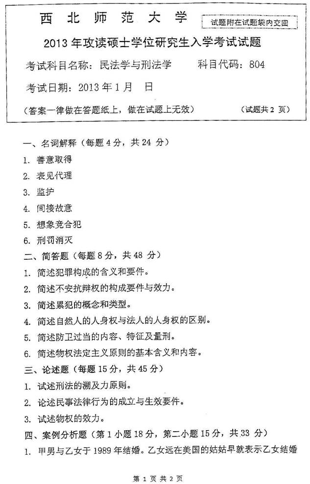2013年西北师范大学法学院804民法学与刑法学考研真题