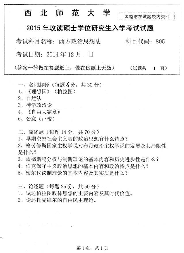 1. [电子书]西北师范大学马克思主义学院《805西方政治思想史》历年考研真题汇总