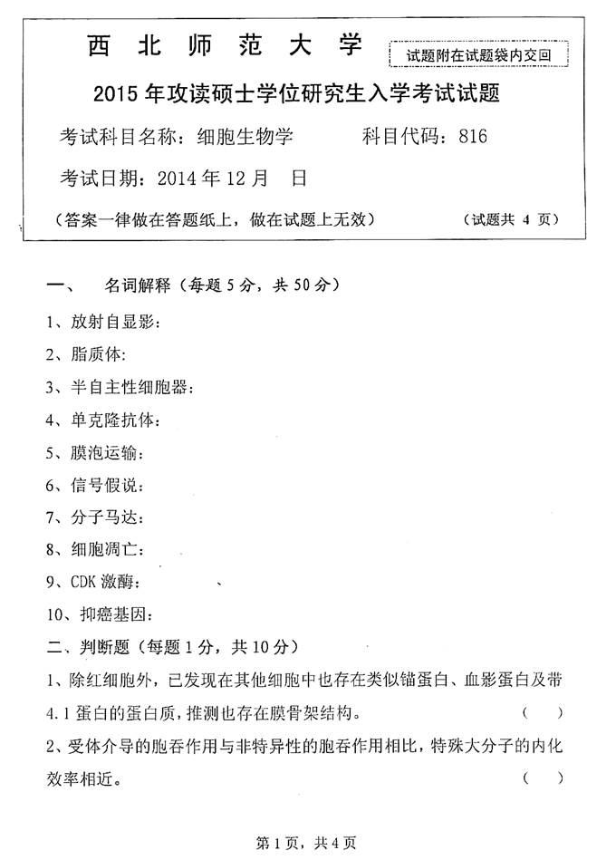 2015年西北师范大学816细胞生物学考研真题(部分)