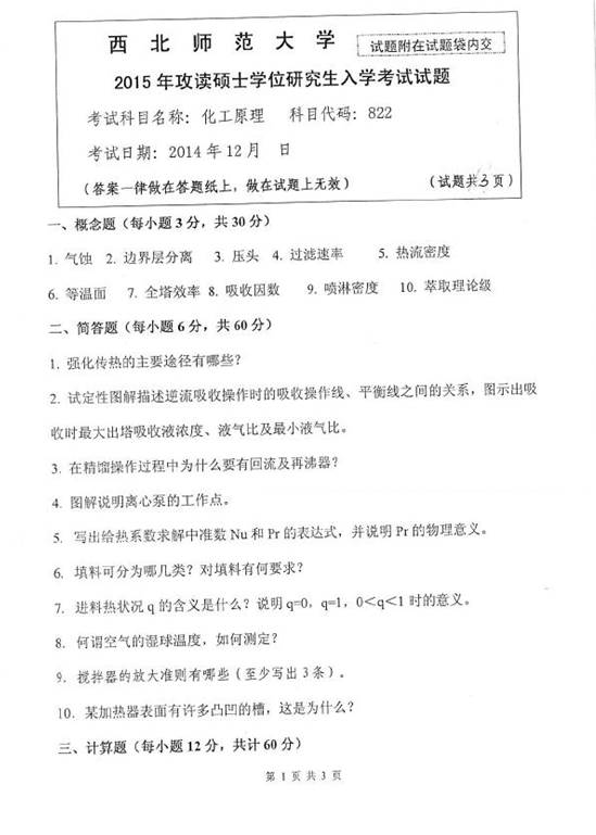 2015年西北师范大学822化工原理考研真题