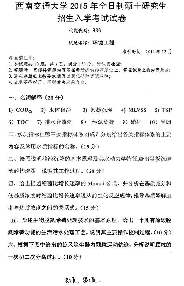 1. 西南交通大学地球科学与环境工程学院《836环境工程》历年考研真题汇总
