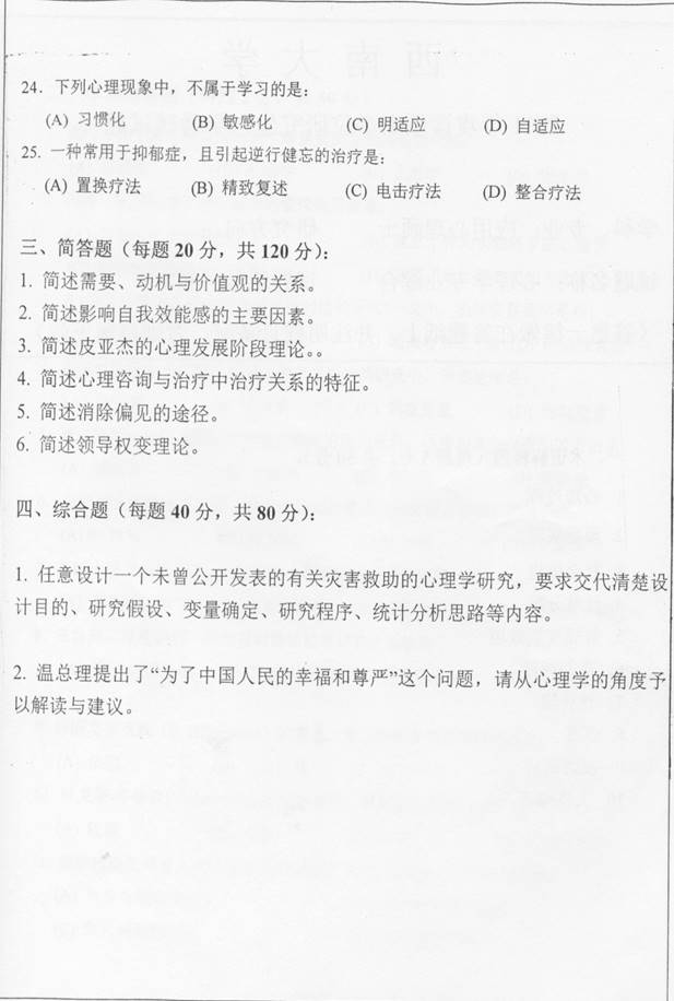 1. 西南大学《347心理学专业综合》[专业硕士]历年考研真题汇总(含部分答案)