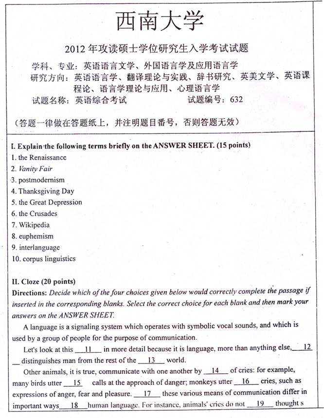 1. 西南大学外国语学院《632英语综合考试》历年考研真题汇总