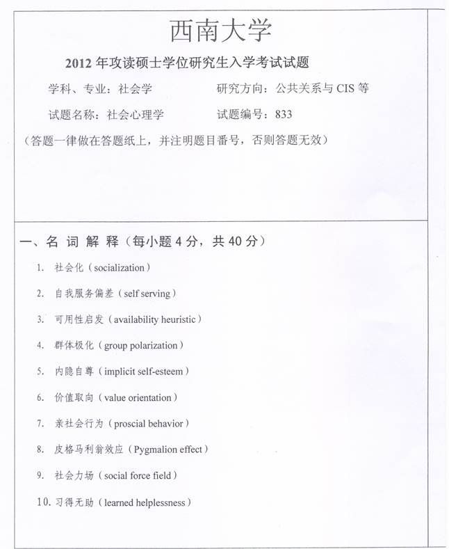 2012年西南大学833社会心理学考研真题