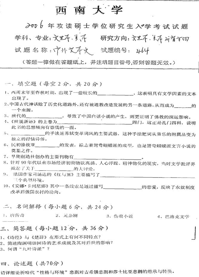 2020年西南大学《853中外文学史》考研真题(回忆版)