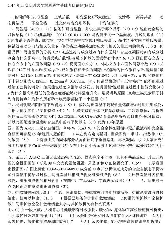 2014年西安交通大学材料科学与基础考研真题(含部分答案)(回忆版)