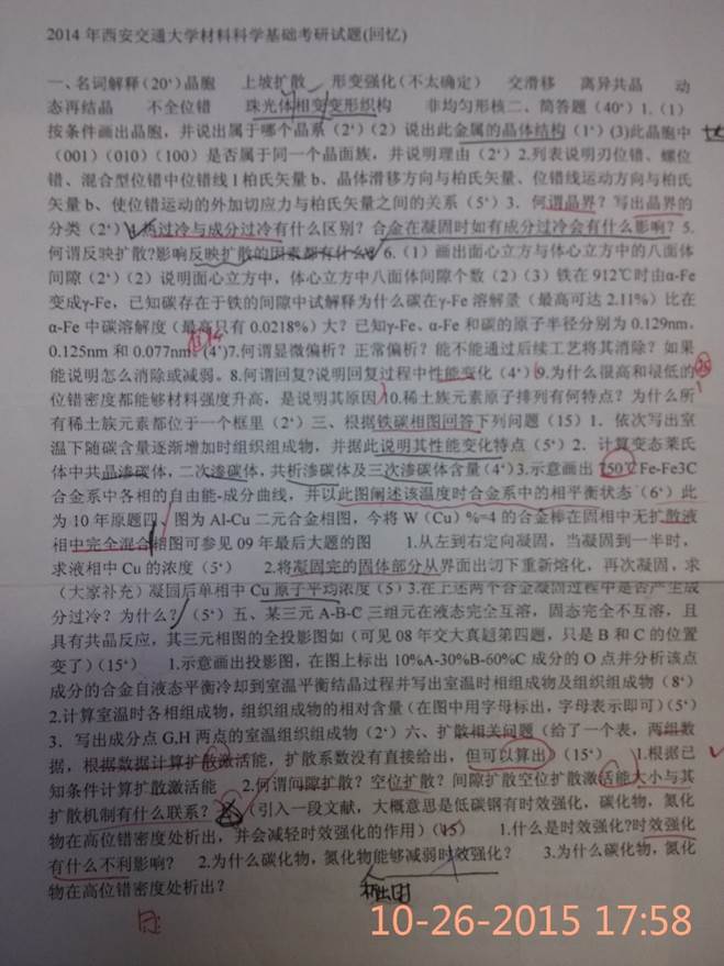 2014年西安交通大学材料科学与基础考研真题(含部分答案)(回忆版)