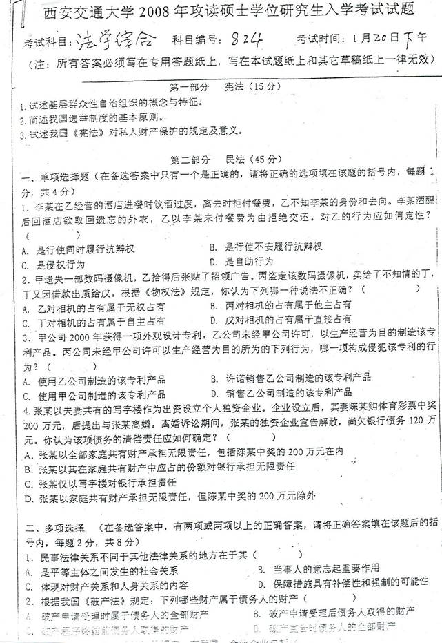 1. [电子书]西安交通大学法学院《824法学综合》历年考研真题汇总