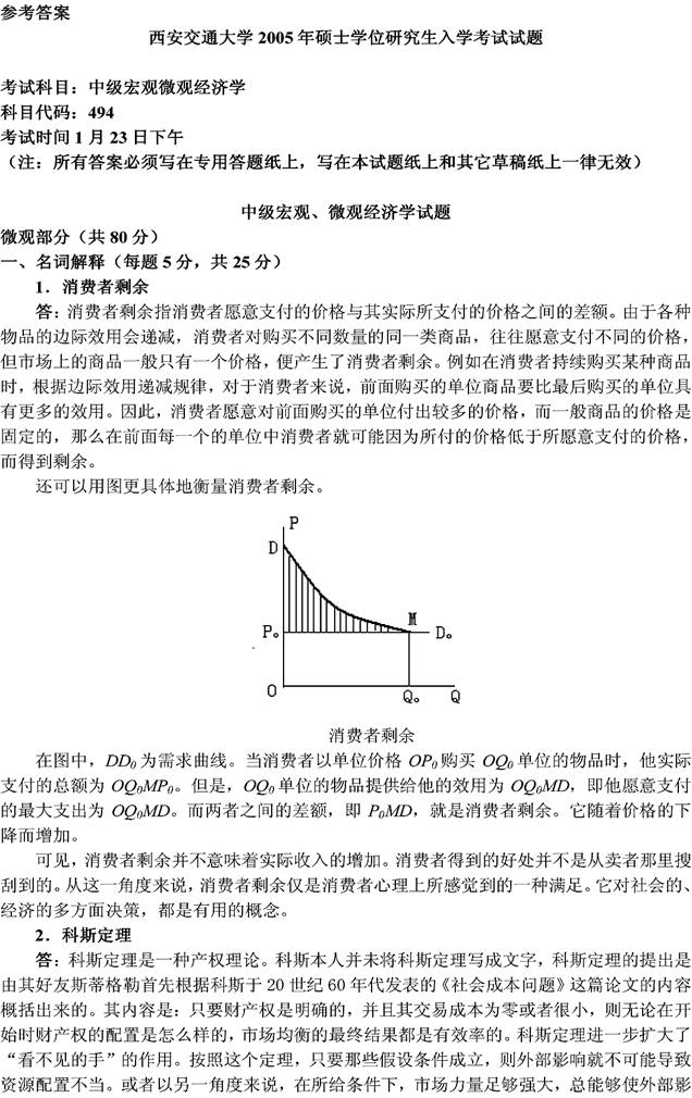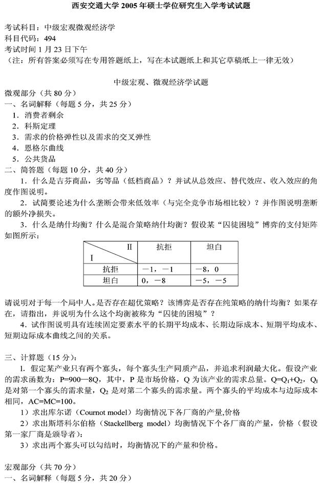 2005年西安交通大学金禾经济研究中心494中级宏观微观经济学考研真题及答案