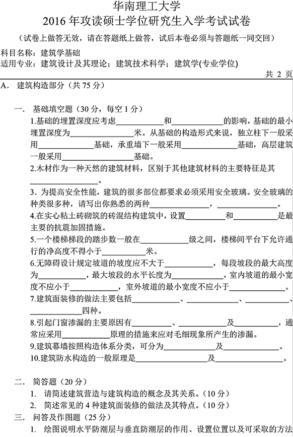 2016年华南理工大学《355建筑学基础》考研真题