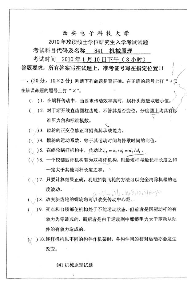 西安电子科技大学《841机械原理》历年考研真题汇总(含部分答案)