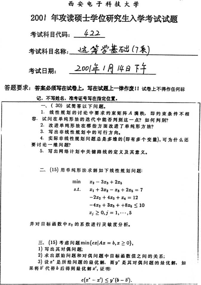 2001年西安电子科技大学422运筹学基础考研真题