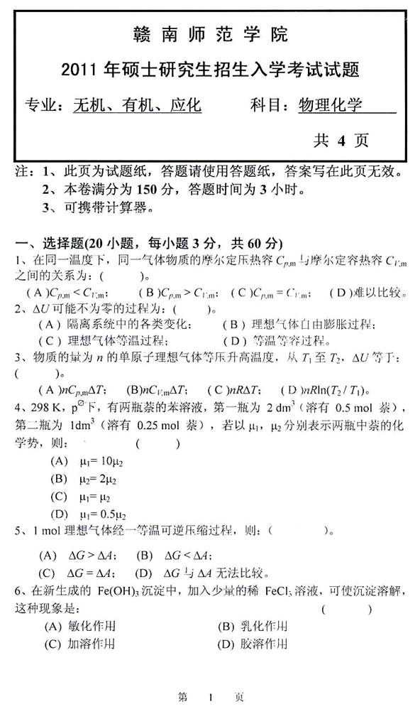1. 赣南师范大学化学化工学院《825物理化学》历年考研真题汇总