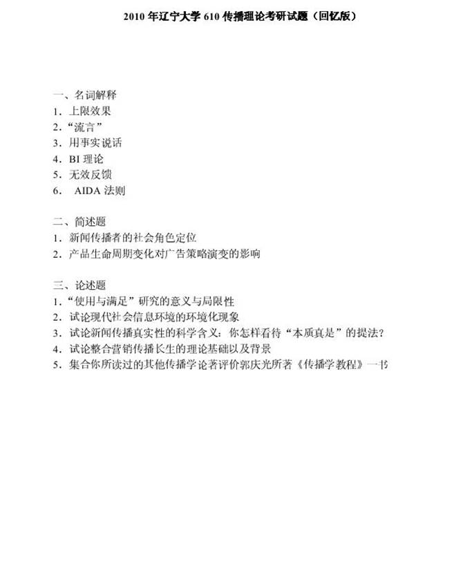 2010年辽宁大学610传播理论考研真题(回忆版)