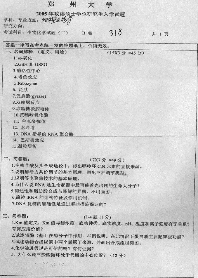 2005年郑州大学《318生物化学(二)》考研真题(B卷)